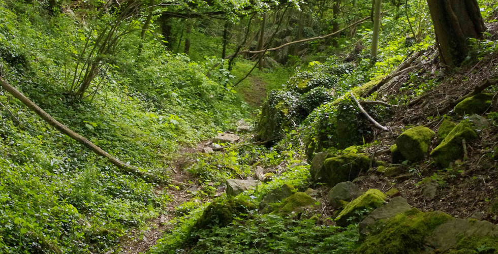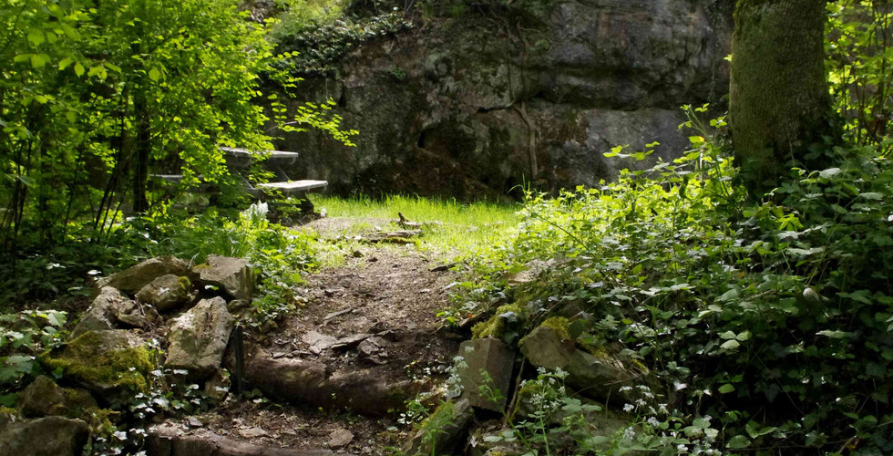 On me guide ensuite vers un petit sentier en terre et plus loin on me fait signe de rentrer dans les fourrés. Je me retrouve face au château des grottes de Floreffe. Sur la tour est perché un déva de l'air.